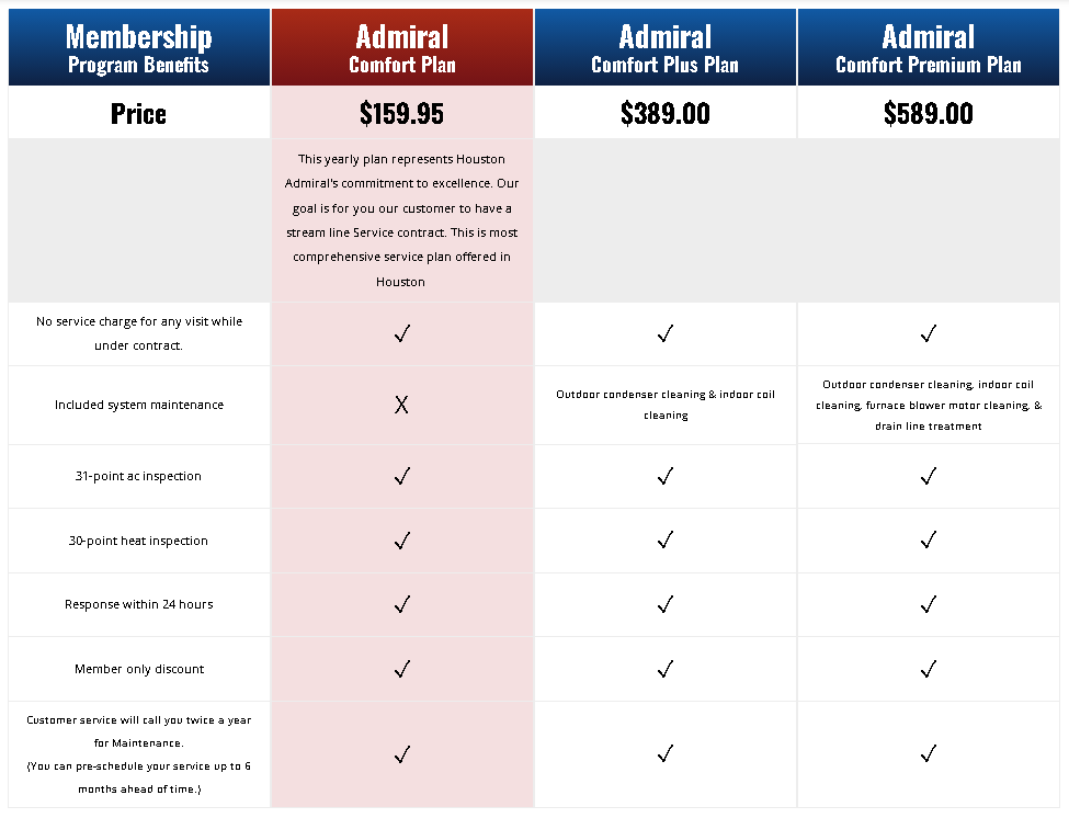 While you’re a member, you’ll also gain credits toward your next HVAC system replacement. As long as you remain a member, these credits will continue to accumulate and can help you save on your next HVAC replacement with Houston Admiral.